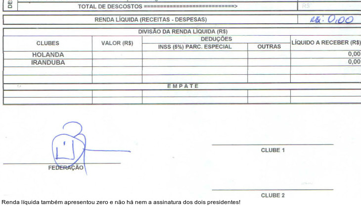 De acordo com o borderô recebido pelo Sr. Goool, o Holanda venceu o Iranduba, por 2 a 0, no último sábado, no Estádio Francisco Garcia, em Rio Preto da Eva, sem a presença de sequer um pagante. Foram colocados à venda 200 ingressos, mas ninguém se interessou.