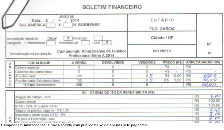 Amazonas - Os Campeonatos Estaduais se especializaram em contabilizar baixos públicos pelos gramados brasileiros. A cada temporada, as arquibancadas ficam ainda mais vazias. Mas em 2014, o Campeonato Amazonense superou todos os padrões. Em um dos 12 Estados que receberá a Copa do Mundo foram registrados públicos de sete e dois pagantes, além da ausência total de torcedor no estádio.