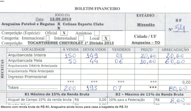Leia a notícia completaNo duelo em Tocantins, foram colocados à venda 200 ingressos. Dos sete vendidos, um foi de arquibancada inteira (R$ 20) e seis de meia arquibancada (R$ 10). A renda bruta da partida chegou a apenas R$ 80 e, mesmo assim, o Araguaína ainda embolsou R$ 33.