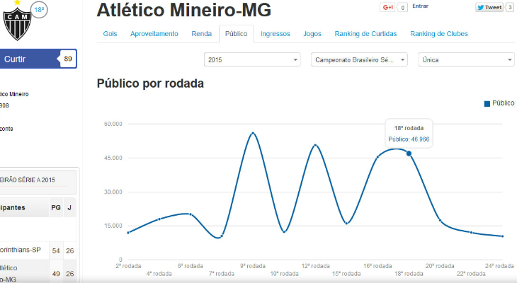 Leia a notícia completaO Cruzeiro, por sua vez, levou 45.991 pagantes ao Mineirão na 25ª rodada. Este foi o maior público da Raposa na Série A. Mas no duelo seguinte como mandante, o Cruzeiro foi deixado de lado pelos torcedores e apenas 19.888 gatos pingados estiveram no maior estádio de Minas Gerais. (Clique aqui e confira o gráfico completo de público do Cruzeiro!)