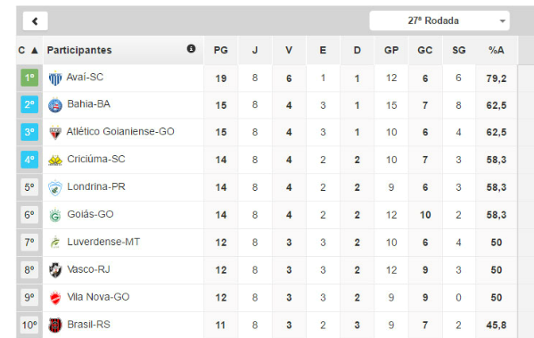 Entre a 20ª e a 27ª rodada, o clube catarinense obteve seis vitórias (três em casa e três fora), um empate como visitante e uma derrota ao lado da torcida, além de 12 gols a favor e seis contra. Aproveitamento de 79,2%. O Bahia, como comparação, ocupa a vice-liderança do returno, mas tem "apenas" 15 pontos. Líder no geral, o Vasco só anotou 12 pontos no 2º turno.Clube paulista já acumula 22 gols de saldo, enquanto mineiro fizeram só 19 gols no Brasileirão