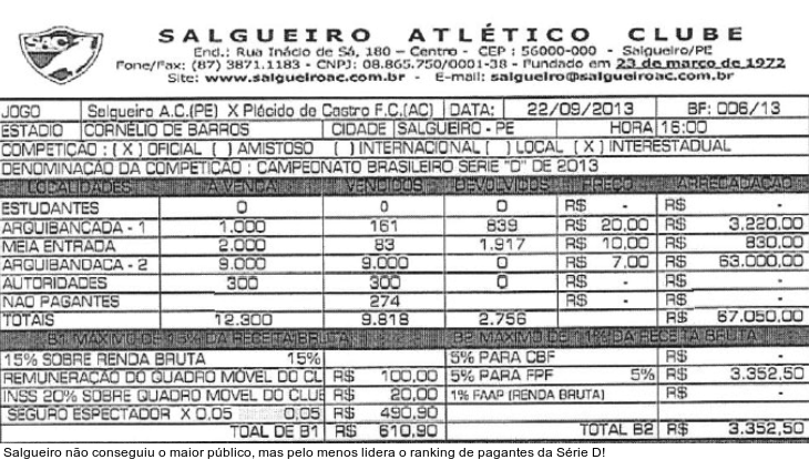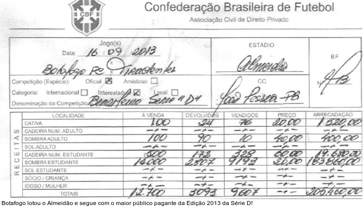 Paraíba - A Confederação Brasileira de Futebol (CBF) divulgou apenas no meio da semana o borderô da vitória do Salgueiro, por 3 a 1, sobre o Plácido de Castro pelas quartas-de-final da Série D do Campeonato Brasileiro. Com o público oficializado, o Carcará - de fato - assumiu a liderança do ranking de pagantes, mas o maior público da Edição 2013 voltou a ser do Botafogo. (Confira os borderôs ao final da matéria!)