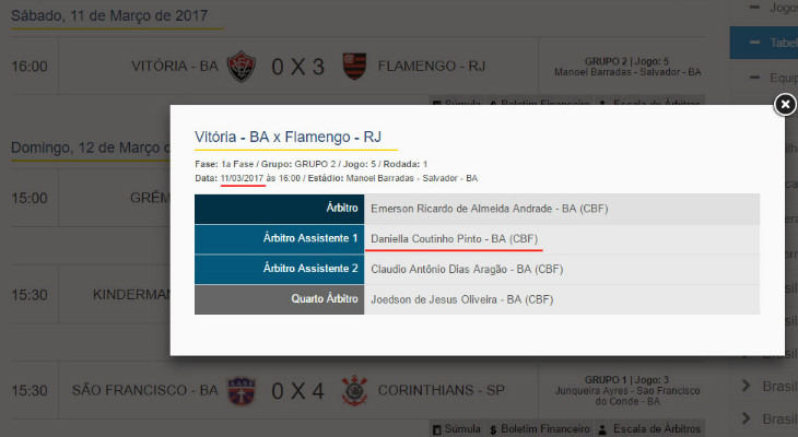 Leia a notícia completaE não foi só! A assistente baiana Daniella Coutinho Pinto, no sábado, atuou na estreia do campeão Flamengo. O Rubro-negro carioca bateu o Vitória, por 3 a 0, no Estádio Barradão, em Salvador pelo Brasileirão Feminino. No domingo, a assistente voltou a campo, em São Francisco do Conde, durante a goleada do Corinthians, por 4 a 0, sobre o São Francisco também pelo Nacional da categoria.