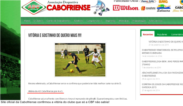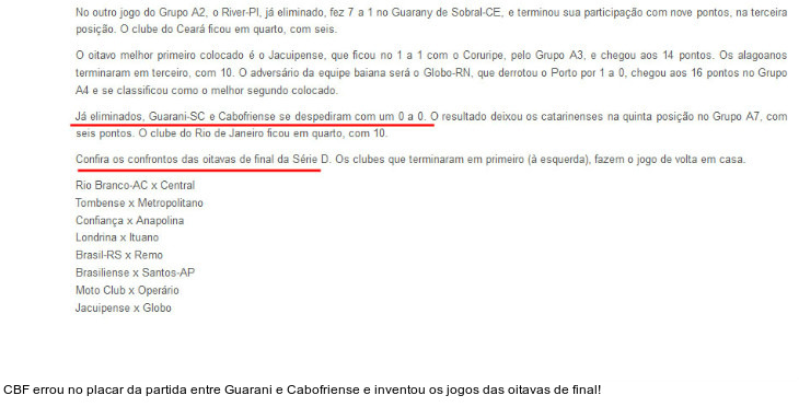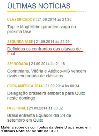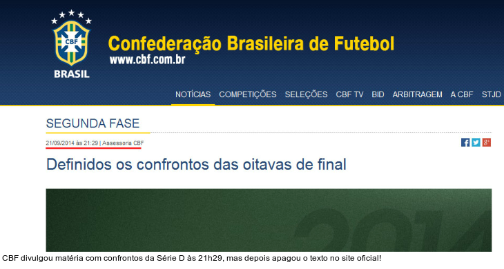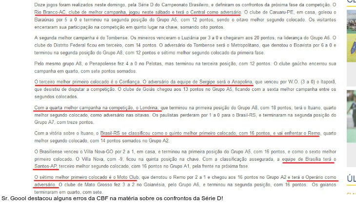 http://www.cbf.com.br/noticias/campeonato-brasileiro-serie-d/definidos-os-confrontos-das-oitavas-de-final-1#.VB9yjRaqvIU). Logo no primeiro parágrafo, o primeiro erro "O Rio Branco-AC, clube de melhor campanha, jogou neste sábado e terá o Central como adversário".