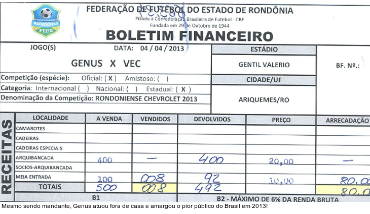 Rondônia - A Federação de Futebol do Estado de Rondônia (FFER) demorou, mas confirmou, nesta semana, que o pior público do futebol brasileiro na temporada 2013 é de apenas oito pagantes. Toda essa multidão compareceu na vitória do Genus, por 3 a 2, sobre o Vilhena, em 4 de abril, pela 6ª rodada do Campeonato Rondoniense.