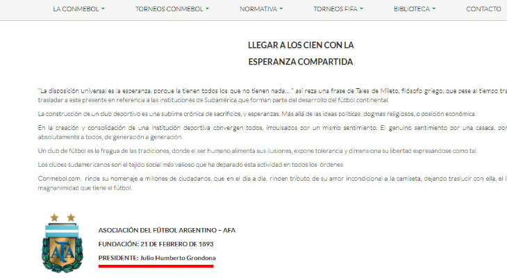 Mas não foram apenas estas pisadas de bola que a CONMEBOL cometeu na página dedicada aos clubes centenários. Na lista de clubes argentinos, a entidade coloca Julio Humberto Grondona como presidente da Associação de Futebol Argentino (AFA). Julio Grandona morreu, em 30 de julho de 2014, devido a problemas cardíacos. Coisas de CONMEBOL.
