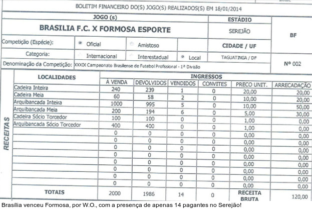 Distrito Federal - A temporada 2014 mal começou, mas o intitulado país do futebol e que receberá a Copa do Mundo entre junho e julho já registra público de apenas 14 pagantes. A façanha aconteceu no jogo entre Brasília e Formosa pela 1ª rodada do Campeonato Brasiliense.