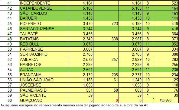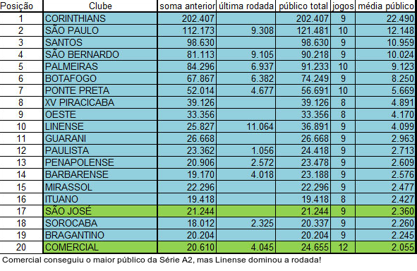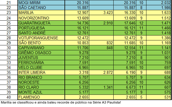 Ainda na Série A3, a Inter de Limeira - também classificada - conseguiu bom público (2.872). A média do clube é de 688 pagantes. Na Série A2, Guaratinguetá (2.910) e Rio Claro (1.341) foram outros clubes que ultrapassaram a marca de mil pagantes.