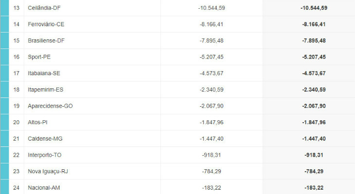 A situação ainda poderia ser pior. Afinal, Madureira e Boavista venderam seus mandos de campo e, com isso, receberam uma renda pré acertada. Caso contrário, a dupla também poderia estar no time dos endividados. O Boavista atuou ante o Internacional em Cascavel e abocanhou R$ 250.000,00. Já o Madureira foi eliminado pelo São Paulo em Londrina, mas embolsou R$ 120.000,00. Deixando esses dois clubes de lado, a melhor renda seria do CSA, único a colocar mais de dez mil torcedores nas arquibancadas (14.206). O duelo no Rei Pelé, em Maceió, gerou receita de R$ 85.398,28.O Fluminense, em compensação, foi um dos clubes do Brasileirão que atuou como mandante, mas colheu déficit. O rombo tricolor chegou a R$ - 303.661,99. Na goleada sobre o Salgueiro, o Flu foi visto por apenas 2.560 torcedores. A dívida do Fluminense é tão assustadora que o déficit do vice-lanterna parece "dinheiro de pinga". O São Caetano foi eliminado em casa e ainda amargou renda negativa de R$ - 27.777,64. São Raimundo-RR (R$ - 25.316,90), Floresta-CE (R$ - 22.670,99) e União-MT (R$ - 20.432,20) foram outros mandantes com déficits superiores a R$ 20 mil.