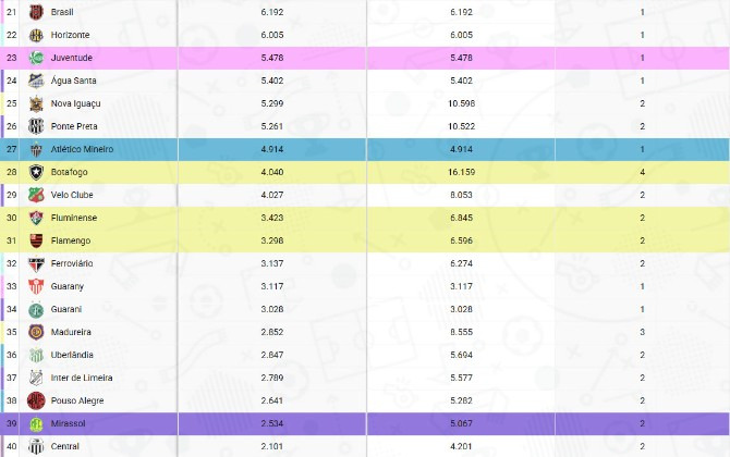 Entre os Estaduais, a melhor média disparada é do Paulistão (11.381). O Pernambucano ocupa a vice-liderança (5.829), pouco acima do Cariocão (5.381). O ranking dos Estaduais com clubes do Brasileirão segue com Baianão (4.693), Mineiro (4.369), Cearense (3.520) e Gauchão (2.798).