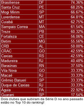 Destaque para os clubes de Mato Grosso. Luverdense e Cuiabá, semifinalistas do Estadual, marcam 64,81% e 62,75%, respectivamente. Sampaio Corrêa (61,54) - campeão da Série D 2012 - e Treze (60,32) completam a lista. Fortaleza (56,06), Betim (55,56%) e CRB (50%) fecham o Top 10.