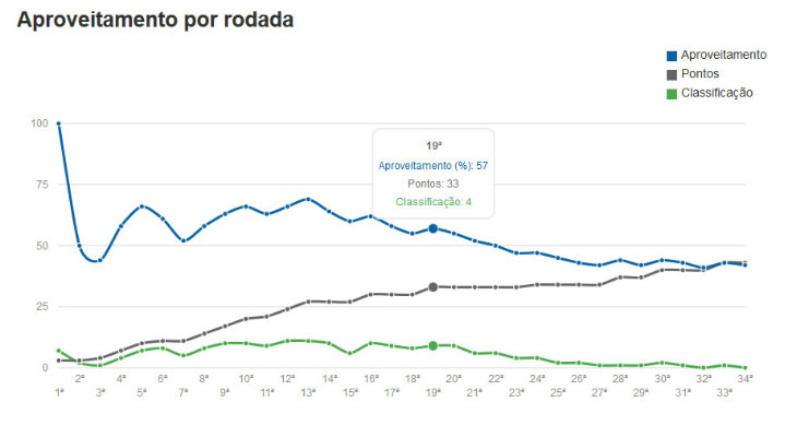 O tropeço foi o 11º em 15 jogos no 2º turno. O clube carioca acumula apenas dez pontos no returno. São três vitórias, um empate e 11 derrotas, além de 14 gols a favor e 27 contra. Aproveitamento de 22,2%. E pensar que este mesmo Fluminense terminou o turno no G4. Aliás, a virada do turno foi o início da decadência carioca. (Veja o gráfico abaixo!)Nos 19 primeiros jogos do Brasileirão, o Tricolor ostentava 33 pontos, apenas sete a menos do que o líder Corinthians. Eram dez triunfos, três empates e seis derrotas, além de 22 tentos a favor e 18 contra. Aproveitamento de 57,9%. Neste momento, a diferença entre Fluminense e Corinthians é de incríveis 33 pontos.