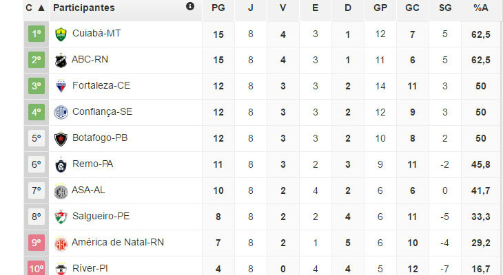 O Cuiabá, em oito partidas, anotou 15 pontos. Aproveitamento de 62,5%. O ABC também tem o mesmo desempenho com quatro vitórias, três empates e uma derrota, além de cinco gols de saldo. Mas o Mais Querido perde a ponta por causa do número de gols marcados no 2º turno (12 a 11). E é este quesito que define também as outras duas posições do G4.O Fortaleza aparece na 3ª colocação com 12 pontos, a mesma pontuação do Confiança. O clube sergipano obteve os mesmos três triunfos, três empates e duas derrotas, além dos três tentos de saldo, mas no número de gols marcados fica atrás dos cearenses (14 a 12). Ainda assim, é uma campanha invejável.