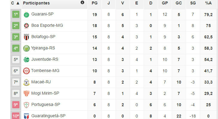 Leia a notícia completaO Guarani é o melhor clube do 2º turno com 19 pontos de 24 possíveis. Boa Esporte (18), Botafogo (15) e Ypiranga (14) completam o G4 do returno, justamente os quatro primeiros colocados do Grupo B na classificação real. Já a Portuguesa manteve a penúltima colocação com seis pontos conquistados no 2º turno.