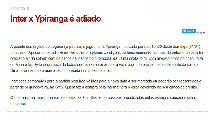 Partidas adiadas, aliás, não faltaram pelo território brasileiro. Cada um com sua desculpa. Internacional e Ypiranga jogarão no próximo sábado após a partida deste domingo ter sido adiada por causa dos estragos causados em Porto Alegre pelo temporal.