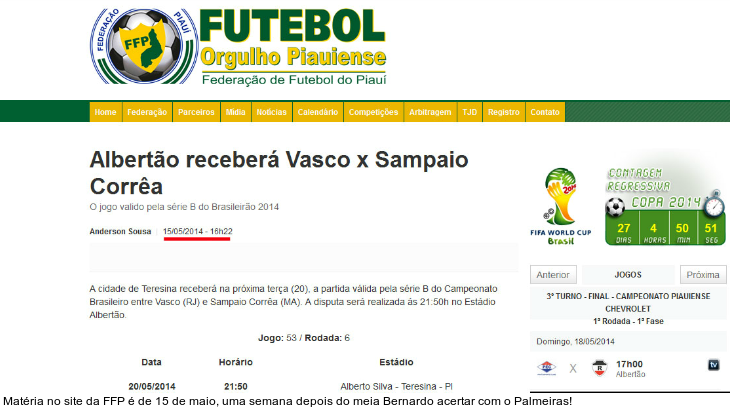 Mas a forma escolhida pela FFP para promover o Estado durante a partida da Série B não foi uma das melhores. No site oficial (http://federacaodefuteboldopiaui.com.br/), a entidade ilustrou a chamada da partida com a foto do meia Bernardo com a camisa do Vasco.É fato que o jogador se transferiu - na semana passada - ao Palmeiras, mais precisamente em 9 de maio. A matéria no site da FFP, intitulada "Albertão receberá Vasco x Sampaio Corrêa", porém, é datada de 15 de maio.
