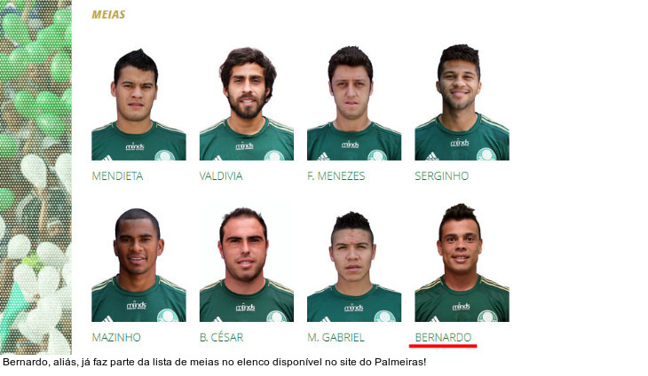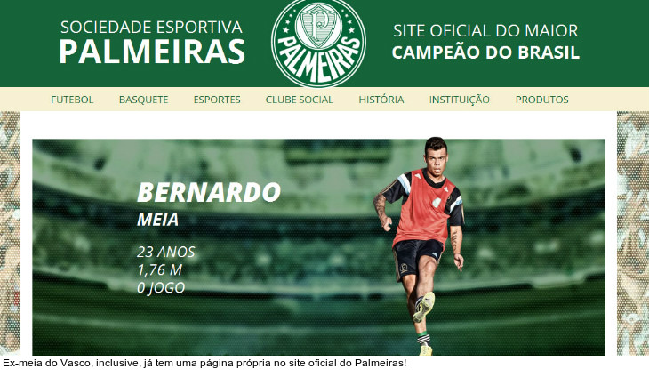 Leia a notícia completaBernardo não vinha sendo utilizado pelo Vasco, onde foi campeão da Copa do Brasil em 2011, e foi emprestado ao Palmeiras até o final do ano, com opção de compra. Aos 23 anos, o jogador, que surgiu no Cruzeiro, já está até na relação do elenco no site oficial do Palmeiras (Vide a galeria de imagens!).
