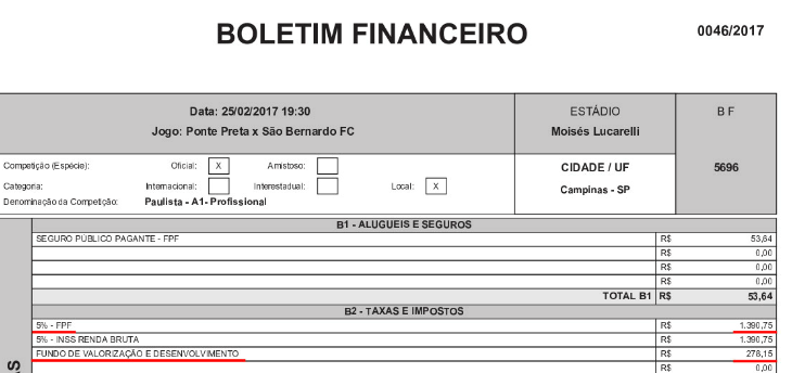 Ainda assim, a renda líquida da vice-campeã paulista é quatro vezes inferior a arrecadação da FPF. E tem mais! A Ponte Preta realizou o jogo com o maior déficit do Paulistão. Pela Primeira Fase, a Macaca recebeu o São Bernardo e amargou dívida de R$ - 29.498,29. Ainda assim, a Ponte Preta foi obrigada a repassar 5% da renda bruta (R$ 1.390,75) e 1% do Fundo de Valorização e Desenvolvimento do Futebol Paulista (R$ 278,15).