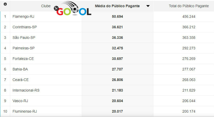 Palmeiras (32.475) e Fortaleza (30.697) são os outros clubes com média superior a 30 mil pagantes. Logo depois vem a turma com média superior a 20 mil apaixonados. São eles: Bahia (27.707), Ceará (26.806), Internacional (21.183), Vasco (20.604) e Fluminense (20.017). Dos 20 clubes do Brasileirão, apenas a lanterna Chapecoense não chega a dez mil fãs (6.320).
