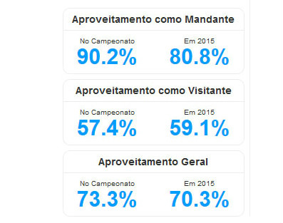 Sem falar que o aproveitamento do Corinthians (73,3%) é o maior da história dos pontos corridos. O time de Cássio, Gil, Elias, Jadson, Renato Augusto e cia. ostenta, após 35 rodadas, 23 vitórias (15 em casa e oito fora), oito empates (um como mandante e sete como visitante) e quatro derrotas (uma diante da torcida e três fora). O Corinthians ainda apresenta a melhor campanha como mandante (90,2%) e a melhor campanha como visitante (57,4%).