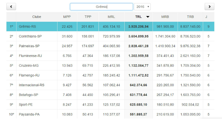 O ranking completo de arrecadação do futebol brasileiro na temporada 2016 pode ser consultado dentro da página de qualquer clube no Sr. Goool. Basta clicar no escudo do seu clube do coração e escolher a aba "Ranking de Clubes". São sete colunas. Para ver o ranking de renda líquida, escolha a coluna com a sigla "TRL" (Total de Renda Líquida). Há também rankings para o total e a média de público pagante, o total e a média de renda liquida e bruta, além da quantidade de jogos.