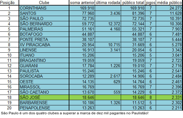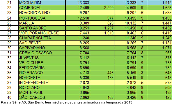 Já o São Bento fica no meio termo, mas apontado para o lado bom da história. O clube de Sorocaba tem a quarta melhor média de público da Série A3 e a 29ª no geral. Em sete jogos como mandante, a média do Bentão é de 1.181 pagantes - número animador para a Terceira Divisão do Estadual.