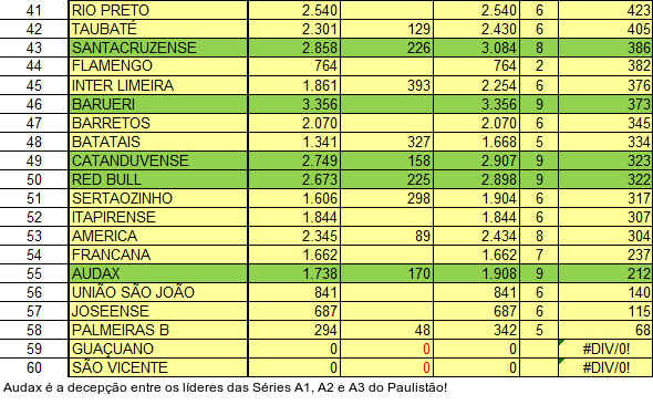 O Audax, por sua vez, deixa a desejar no quesito arquibancada cheia. Residente da capital, o Audax já está classificado para a próxima fase da Série A2. Mas a história é diferente no ranking de público. Lanterna da competição, o Audax amarga a 55ª colocação no geral, com média de só 212 pagantes. Na última rodada, o clube levou 170 pagantes ao estádio.