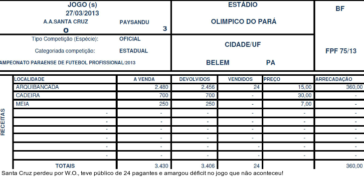 Pará - A diretoria do Santa Cruz ameaçou e garantiu que não entraria em campo antes mesmo do duelo contra o Paysandu, no Mangueirão, em Belém, pela 7ª rodada da Taça Estado do Pará. Mesmo assim, 24 corajosos pagaram ingresso, como mostra o borderô da partida. (Veja o arquivo completo ao final da matéria!).