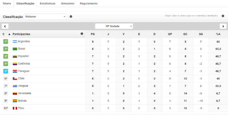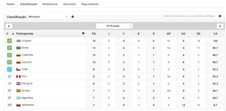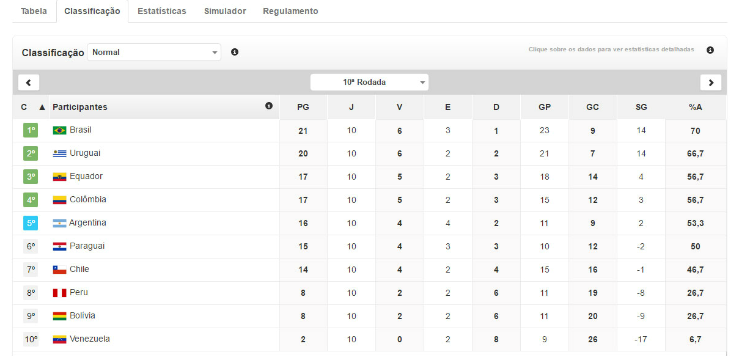 Leia a notícia completaNa classificação normal da Eliminatória Sul-americana, Brasil (21), Uruguai (20), Equador (17) e Colômbia (17) estão na zona de classificação para a Copa do Mundo, enquanto a Argentina (16) aparece na zona da repescagem.