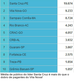 Pernambuco - Não que a média de público pagante do Vila Nova seja de se jogar fora - supera 11 clubes da Série A, 19 da Série B e 19 da Série C -, mas se comparada a do Santa Cruz fica imperceptível. Líder da Série C do Campeonato Brasileiro e dono da terceira maior média de público do Brasil, o Tricolor pernambucano ostenta número de pagantes duas vezes maior do que a apresentada pelos goianos. (Confira o ranking completo AQUI!)