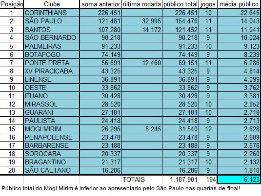 Leia a notícia completaEm 12 jogos como mandante, o Mogi Mirim levou 31.540 torcedores ao estádio. O total de público do Sapão é inferior ao apresentado na vitória do São Paulo, por 1 a 0, sobre o Penapolense (32.995). O Tricolor paulista tem a segunda melhor média (14.043), atrás apenas do Corinthians (22.645) - seu rival nas semifinais.
