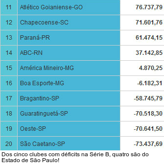 Por outro lado, cinco clubes pagaram para jogar. O quinteto está no vermelho, acumula déficits com as rendas líquidas. O pior cenário é do São Caetano, vice-lanterna no ranking de público. O Azulão acumula dívidas de R$ - 73.437,69. Aliás, as últimas quatro colocações são de clubes paulistas.