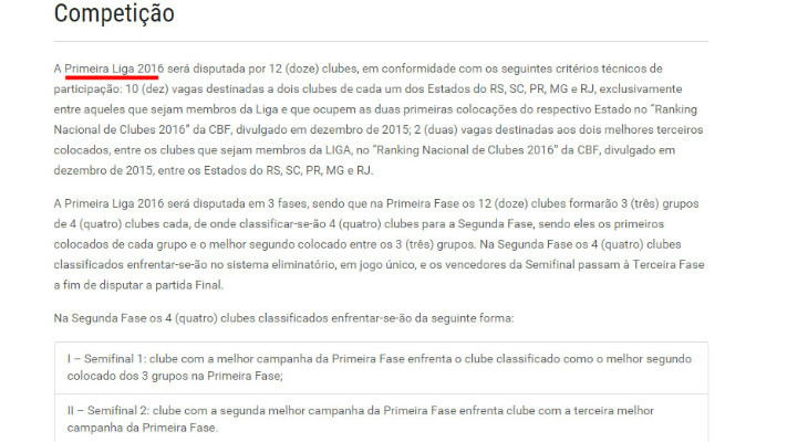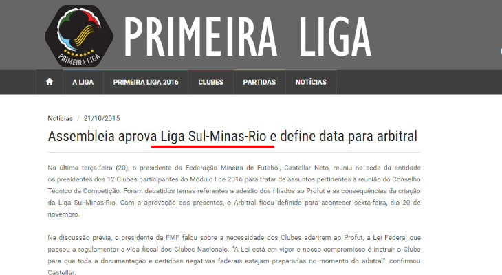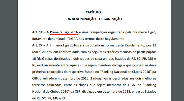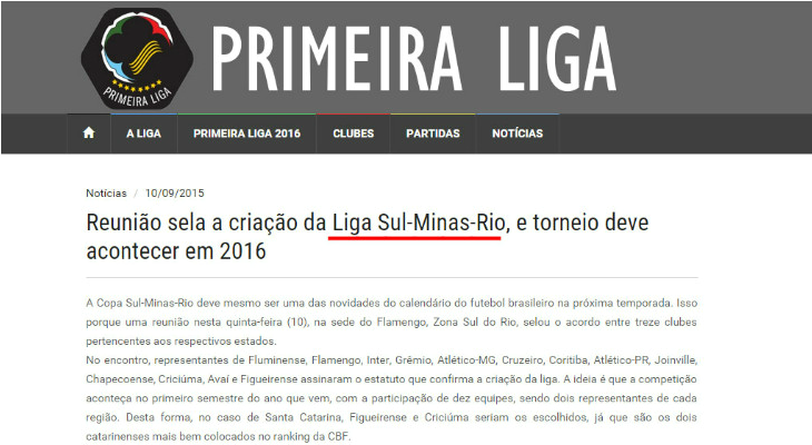 No Regulamento Específico da Competição, em nenhum momento a Primeira Liga utiliza a denominação Copa da Primeira Liga. Este é o termo que passou a ser utilizado pela entidade. No regulamento, a competição é chamada de Primeira Liga. "A Primeira Liga 2016 será disputada na forma deste Regulamento, por 12 (doze) clubes...". O mesmo acontece no Regulamento Geral da Competição e no Plano de Ação.A confusão aumenta ao acessar o histórico de notícias. A primeira matéria no site da Primeira Liga, em 10 de setembro de 2015, começa assim: "A Copa Sul-Minas-Rio deve mesmo ser uma das novidades do calendário do futebol brasileiro na próxima temporada". Detalhe: o título da matéria foi "Reunião sela a criação da Liga Sul-Minas-Rio, e torneio deve acontecer em 2016".
