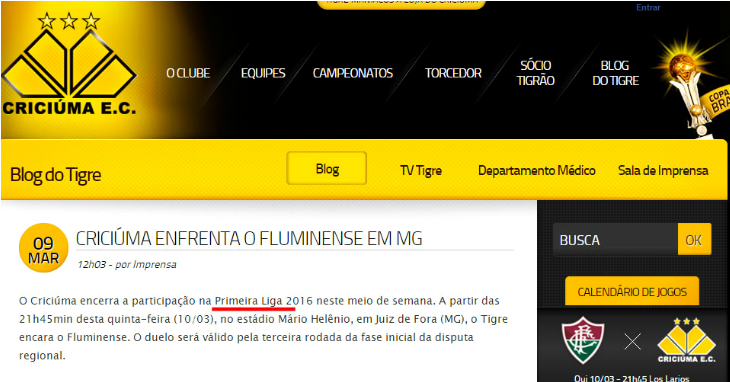 Leia a notícia completaNas páginas oficiais dos clubes integrantes da Copa da Primeira Liga há a mesma confusão. Avaí e Figueirense optam pela Copa Sul-Minas-Rio. Criciúma, Grêmio e Internacional, por outro lado, chamam o torneio de Primeira Liga. Enquanto isso, os outros participantes preferem Copa da Primeira Liga.