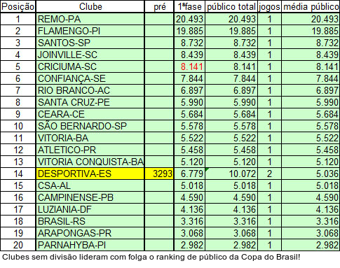 Dos clubes do Brasileirão, o Atlético Paranaense encontra-se no 12º lugar, com média de 5.458 pagantes. Eliminado ainda na Primeira Fase, o Náutico aparece no 23º lugar, com média de 2.326 pagantes. Mas a Portuguesa faz ainda pior. Outro clube do Brasileirão eliminado na fase inicial, a Lusa ostenta a 39ª melhor média de público com 881 pagantes.