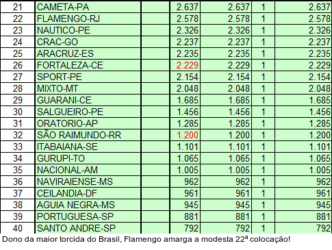 O público do clube nordestino, aliás, é melhor do que o apresentado pelo Flamengo original, dono da maior torcida do Brasil. No embate contra o Santos, o Flamengo piauiense levou ao estádio 19.885 pagantes. Já o xará carioca eliminou o Remo com a presença de só 2.578 pagantes.