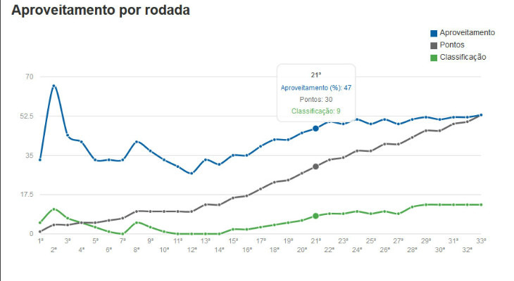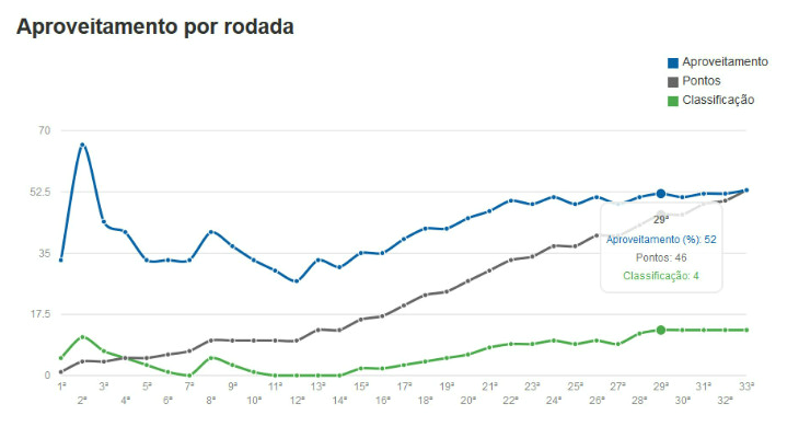 De acordo com o levantamento do Sr. Goool, a campanha do Santos com Dorival Júnior só é inferior ao desempenho do líder Corinthians. O time comandado por Dorival Júnior ostenta aproveitamento de 68,25%. São 21 jogos com 13 vitórias, quatro empates e apenas quatro derrotas. Com este desempenho, o Santos garantiria a vice-liderança da Série A.O Timão lidera o Nacional com 73 pontos em 33 jogos. Aproveitamento incrível de 73,7%. O Atlético Mineiro, vice-líder, ostenta 62 pontos e aproveitamento de 62,6%. O Grêmio, por sua vez, ocupa a 3ª posição com 59 pontos e aproveitamento de 59,6%. Juntando os jogos do Santos, antes e depois de Dorival, o Peixe aparece no 4º lugar com 53 pontos e aproveitamento de 53,5%.