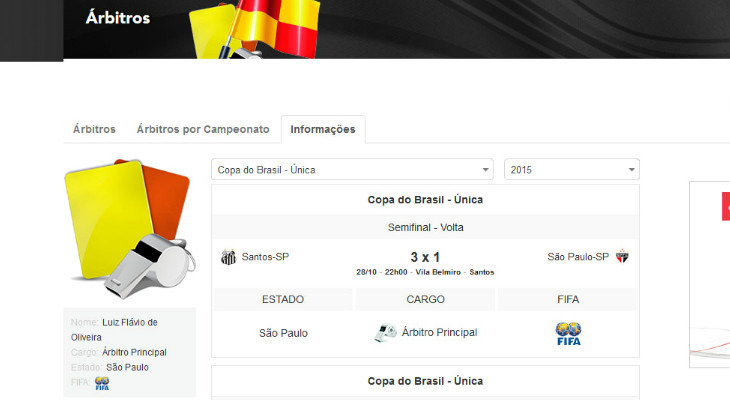 São Paulo - O árbitro paulista e do quadro da FIFA Luiz Flávio de Oliveira foi o escolhido para apitar o primeiro jogo da final da Copa do Brasil entre Santos e Palmeiras, nesta quarta-feira, às 22 horas, na Vila Belmiro. Nesta terça-feira, o Sr. Goool trará um Raio-X completo do juizão. Nada de polêmica e muito menos teoria da conspiração. O objetivo é simplesmente revelar a trajetória de Luiz Flávio de Oliveira na temporada 2015 do futebol brasileiro. (Clique na imagem abaixo e digite o nome do árbitro para você ter todas as informações na ferramenta exclusiva do Sr. Goool!)