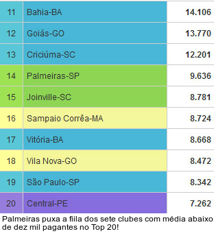O Joinville (8.781), além de Sport e Palmeiras, é outro clube da Série B que está no Top 20. Sampaio Corrêa (8.724) e Vila Nova (8.472) completam a lista da Série C. Enquanto isso, o Central é o único representante da Série D no Top 20. O clube pernambucano ostenta média de 7.262 pagantes.