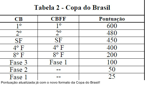 j) Considerando que a Copa do Brasil até 2012 foi disputada em seis fases, não será considerada para o referido período a pontuação referente à fase 1 da Tabela 2.